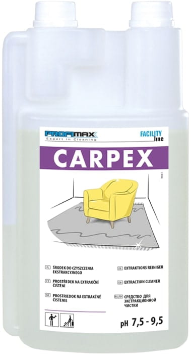 CARPEX Środek przeznaczony do ekstrakcyjnego czyszczenia dywanów, wykładzin dywanowych i tapicerek - trwale barwionych i odpornych na działanie wody. Szybko i skutecznie usuwa brud, kurz oraz plamy. Nie zawiera rozjaśniaczy optycznych ani wybielaczy. Pozostawia przyjemny zapach.