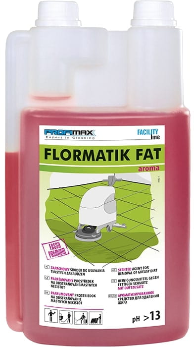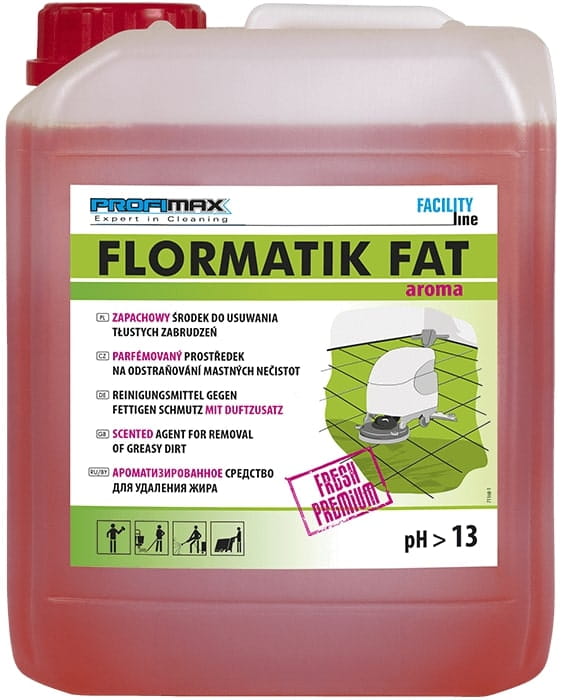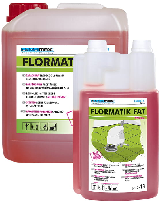 FLORMATIK FAT aroma jest mieszaniną alkaliów i związków powierzchniowo czynnych o bardzo silnym działaniu, przeznaczony do szybkiego i skutecznego usuwania tłustych zabrudzeń olejowo-smarowych, śladów po gumie z opon wózków widłowych oraz osadów kuchennych i z wodoodpornych powierzchni, takich jak: posadzki betonowe, PVC, kamień naturalny i sztuczny, ściany, części maszyn i silników. Służy także do prania odzieży roboczej.