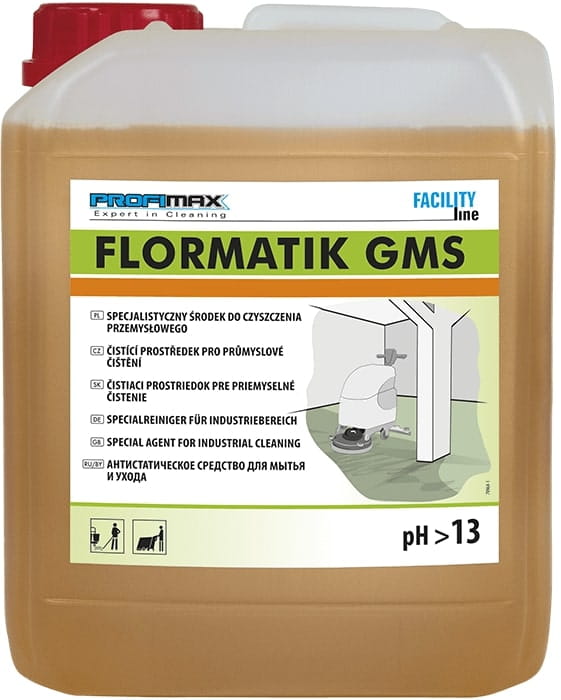 FLORMATIK GMS to silny alkaliczny środek, który przeznaczony jest do mycia wodoodpornych posadzek przemysłowych niezabezpieczonych polimerami. Można stosować go do czyszczenia wszystkich typów powierzchni z wyjątkiem podłóg drewnianych i wykładzin tekstylnych.