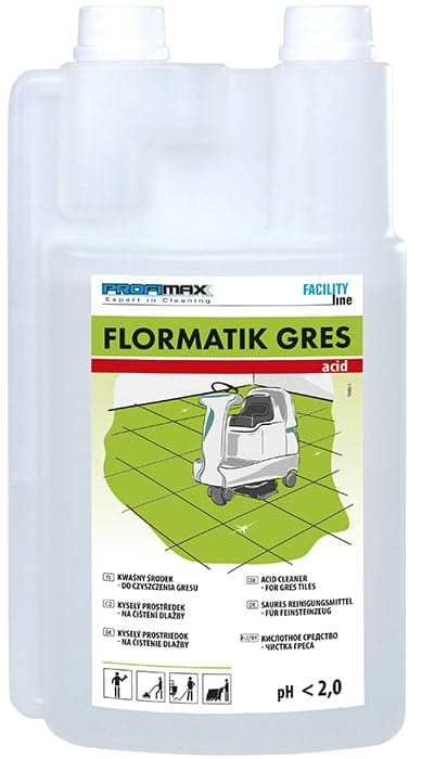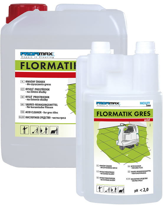 FLORMATIK GRES ACID jest środkiem o kwaśnym pH, na bazie kwasu fosforowego, który w zależności od zastosowanego stężenia doskonale nadaje się do gruntownego czyszczenia oraz do mycia mikroporowatych wodoodpornych powierzchni. W szczególności zalecany jest do czyszczenia gresu i płytek antyposlizgowych