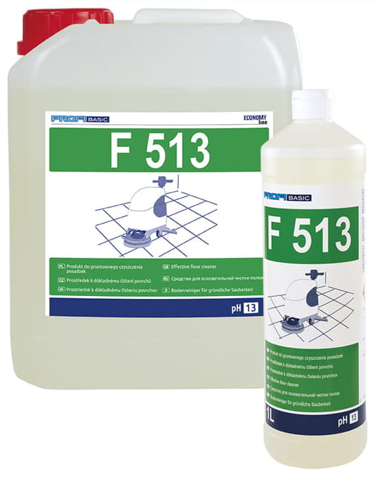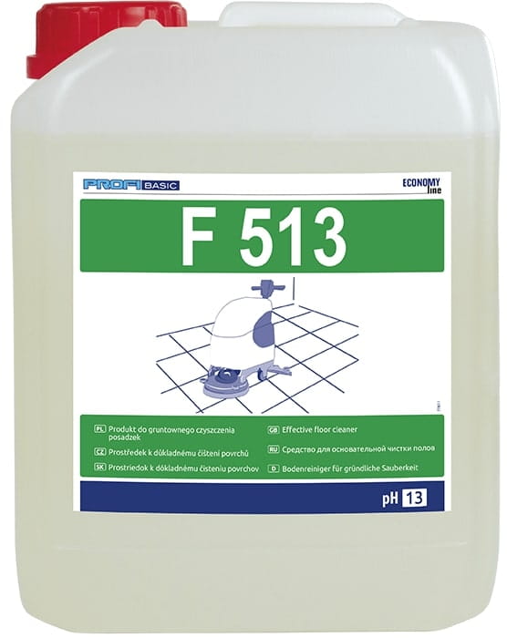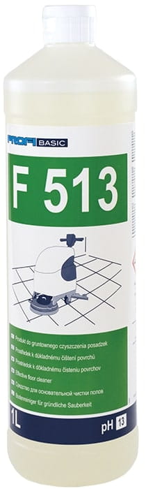 PROFIBASIC F 513 to skoncentrowany, alkaliczny środek o silnym działaniu. Stosowany do gruntownego mycia podłóg wodoodpornych oraz odpornych na działanie mocnych alkaliów, takich jak.: PVC, kamień sztuczny, gres, granit, żywica epoksydowa itp.