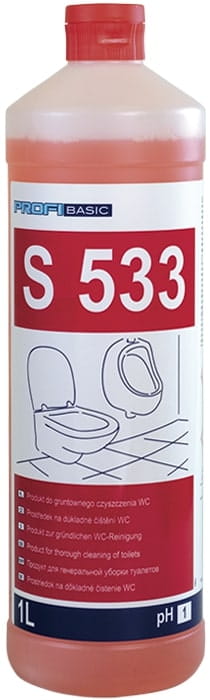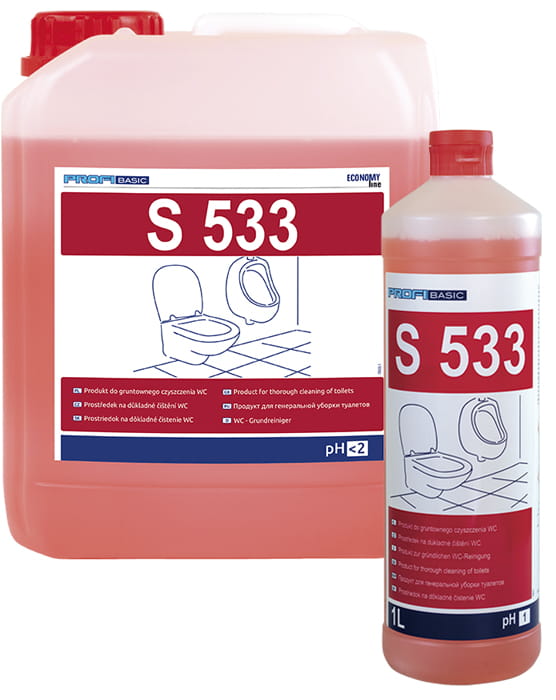 PROFIBASIC S 533 środek do gruntownego czyszczenia WC przeznaczony do czyszczenia wszystkich powierzchni odpornych na działanie kwasów jest skutecznym środkiem na bazie kwasu solnego do usuwania rdzy, osadów wapiennych i moczowych z powierzchni odpornych na działanie kwasów.