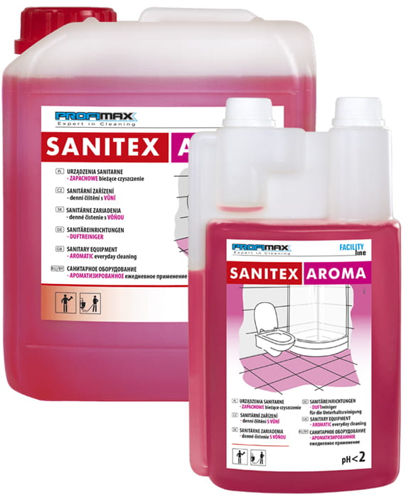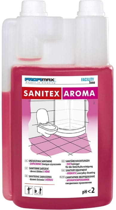 SANITEX AROMA jest zapachowym środkiem do codziennego czyszczenia powierzchni i urządzeń sanitarnych odpornych na kwasy, takich jak: muszle klozetowe, pisuary, bidety, wanny, umywalki z ceramiki i stali szlachetnej, otwory ściekowe, syfony itp. Środek pozostawia na długo przyjemny malinowy zapach.