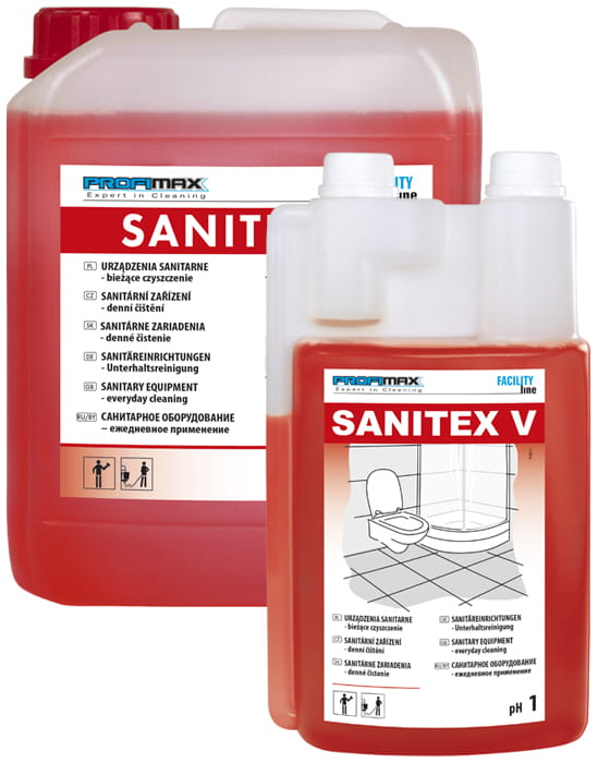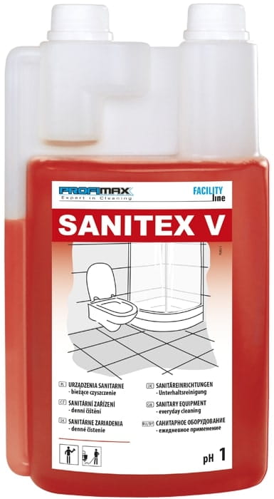 Sanitex V jest profesjonalnym środkiem do codziennego czyszczenia powierzchni i urządzeń sanitarnych odpornych na kwasy np. muszle klozetowe, pisuary, bidety, wanny, umywalki z ceramiki i stali szlachetnej.
