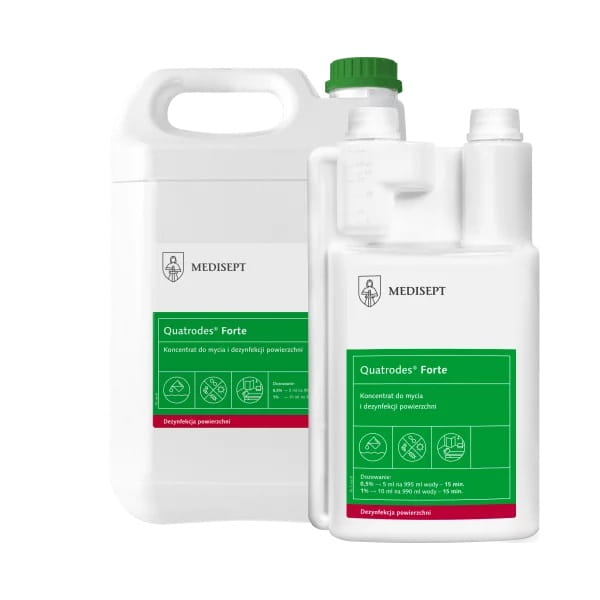 Quatrodes® Forte to płynny koncentrat do jednoczesnego mycia i dezynfekcji powierzchni w obszarze medycznym (unity, łóżka i fotele zabiegowe, stoły operacyjne, aparatura medyczna) – jakow wyrób medyczny.