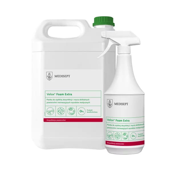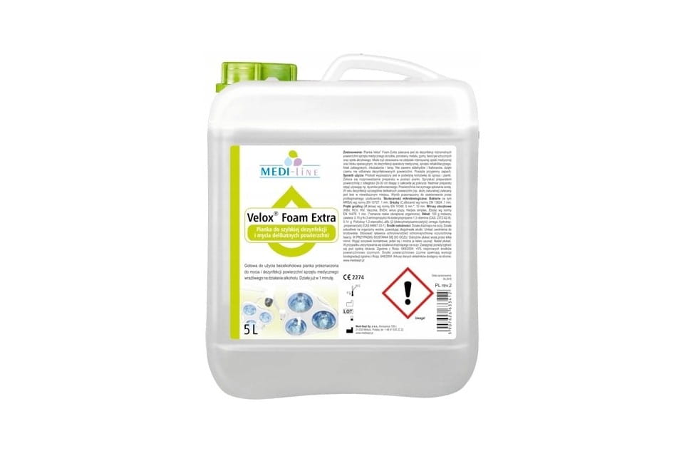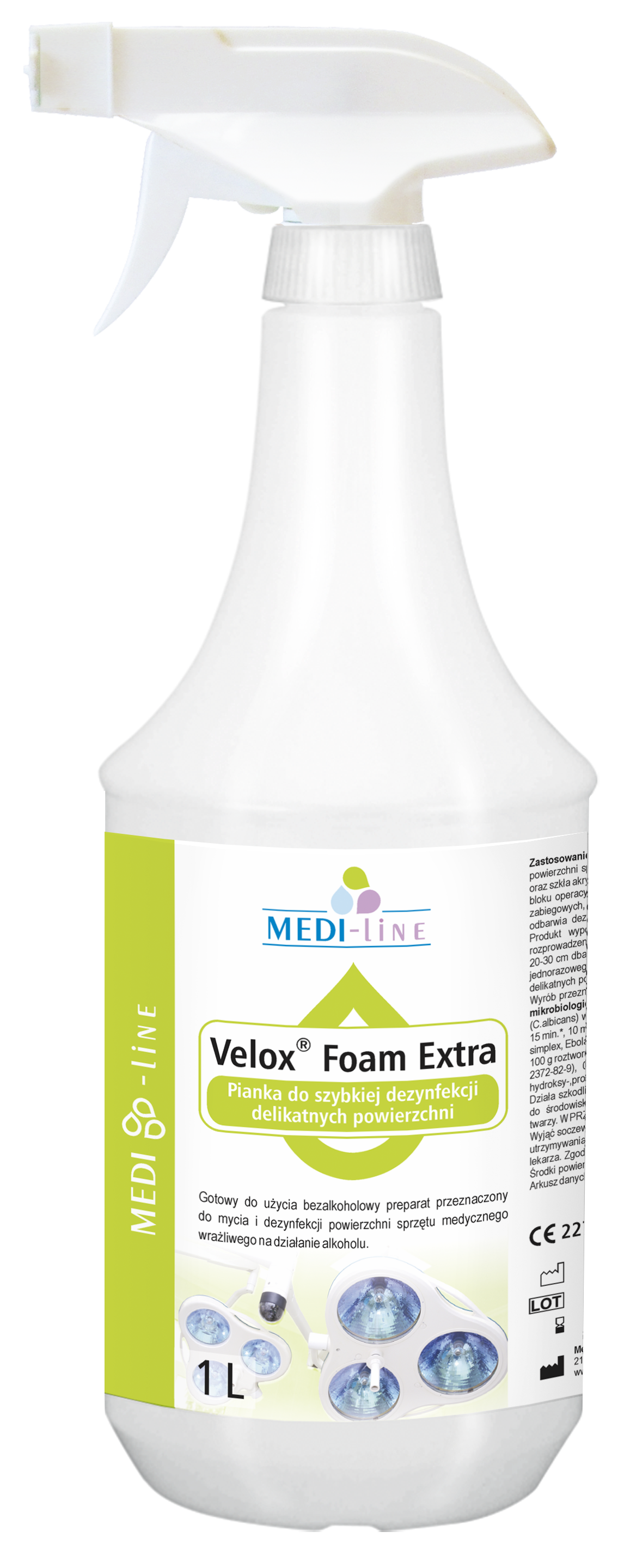 Zastosowanie: Pianka Velox Foam Extra zalecana jest do dezynfekcji różnorodnych powierzchni sprzętu medycznego ze szkła, porcelany, metalu, gumy, tworzyw sztucznych oraz szkła akrylowego. Może być stosowana na oddziale intensywnej opieki medycznej oraz bloku operacyjnym, do dezynfekcji aparatury medycznej, sprzętu rehabilitacyjnego, foteli zabiegowych, inkubatorów i lamp. Nie zawiera aldehydów i fosforanów, dzięki czemu nie odbarwia dezynfekowanych powierzchni. Posiada przyjemny zapach