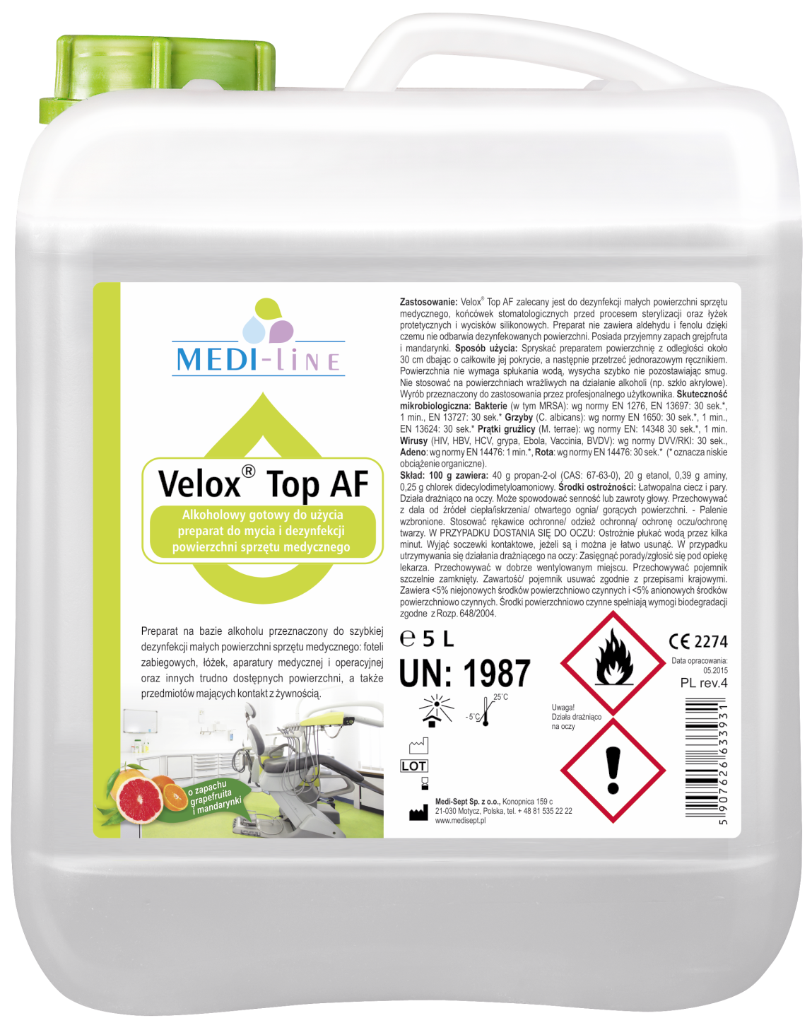 Zastosowanie: Preparat na bazie alkoholu przeznaczony do szybkiej dezynfekcji małych powierzchni sprzętu medycznego: foteli zabiegowych, łóżek, aparatury medycznej i operacyjnej oraz innych trudno dostępnych powierzchni, a także przedmiotów mających kontakt z żywnością. Zalecany jest również do dezynfekcji końcówek stomatologicznych przed procesem sterylizacji oraz protez i wycisków silikonowych. Preparat nie zawiera aldehydu i fenolu dzięki czemu nie odbarwia dezynfekowanych powierzchni. Posiada dwie wersje zapachowe: neutral oraz zapach grapefruita i mandarynki