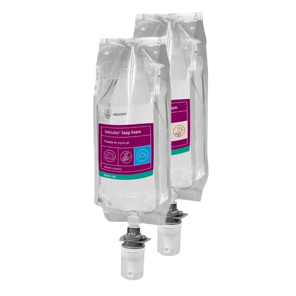 Velodes Soap Foam to delikatny płyn aplikowany w postaci pianki do higienicznego mycia rąk. Płyn nie zawiera mydła, dzięki czemu może być stosowany u osób z alergią i nietolerancją na produkty na bazie mydła. Płyn tworzy białą, trwałą i gęstą pianę delikatnie pokrywając myte dłonie. Ze względu na zawartość składników pielęgnujących i nawilżających zalecana jest dla personelu medycznego narażonego w wyniku częstego mycia na macerację skóry.