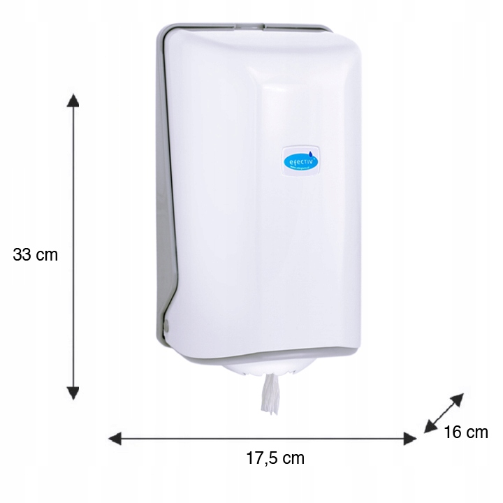 Wymiary dozownika: 33 cm (wysokość) x 17,5 cm (szerokość) x 16 cm (głębokość)