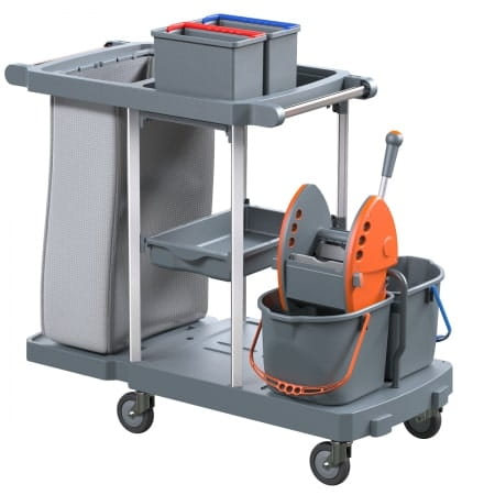 Idealny do środowisk wymagających odkurzania, zbierania odpadów oraz mycia podłóg i powierzchni w jednym wózku.