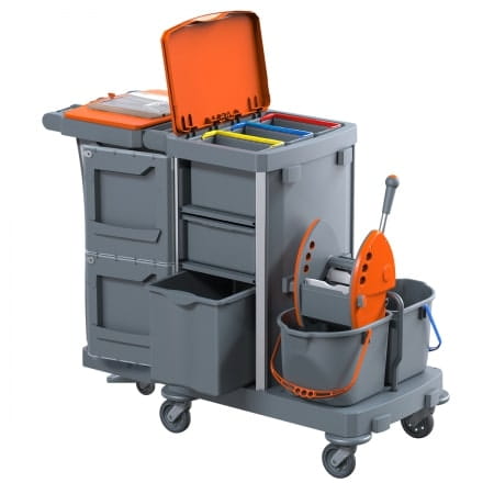 Idealny do środowisk wymagających mycia i odkurzania podłóg i innych powierzchni, wszystko dostępne w jednym wózku.
