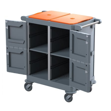 - Dostępny z pełnymi lub połówkowymi drzwiami otwieranymi pod kątem 270° dla większej wygody podczas użytkowania. Są one zamykane, aby zapewnić bezpieczeństwo i higienę oraz schludny wygląd wózka. Wyjątkowo solidna podstawa i kółka Ø125 mm Silent Wheel, zaprojektowane i wyprodukowane w TWT, gwarantują łatwą, płynną i cichą mobilność wózka nawet przy dużych obciążeniach lub w obecności dywanów.