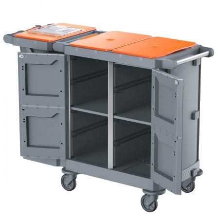 - Dostępny z pełnymi lub połówkowymi drzwiami otwieranymi pod kątem 270° dla większej wygody podczas użytkowania. Są one zamykane na klucz, aby zapewnić bezpieczeństwo i higienę oraz schludny wygląd wózka. Wyjątkowo wytrzymała podstawa i kółka Ø125 mm Silent Wheel, zaprojektowane i wyprodukowane w TWT, zapewniają wózkowi większą zwrotność i cichą pracę nawet przy dużych obciążeniach lub w obecności dywanów.