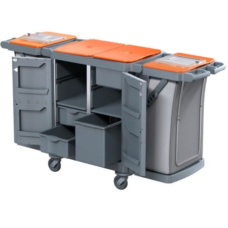 - Dostępny z pełnymi lub połówkowymi drzwiami otwieranymi pod kątem 270° dla większej wygody podczas użytkowania. Są one zamykane, aby zapewnić bezpieczeństwo i higienę oraz schludny wygląd wózka. Wyjątkowo mocna podstawa i kółka Ø125 mm Silent Wheel, zaprojektowane i wyprodukowane w TWT, zapewniają płynniejszą i cichszą jazdę wózka nawet przy dużych obciążeniach lub wykładzinach dywanowych.