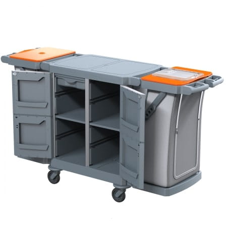 - Dostępny z pełnymi lub połówkowymi drzwiami otwieranymi pod kątem 270° dla większej wygody podczas użytkowania. Są one zamykane, aby zapewnić bezpieczeństwo i higienę oraz schludny wygląd wózka. Szczególnie solidna podstawa i kółka Ø125 mm Silent Wheel, zaprojektowane i wyprodukowane przez TWT, gwarantują łatwą, płynną i cichą mobilność wózka nawet przy dużych obciążeniach lub w obecności dywanów.