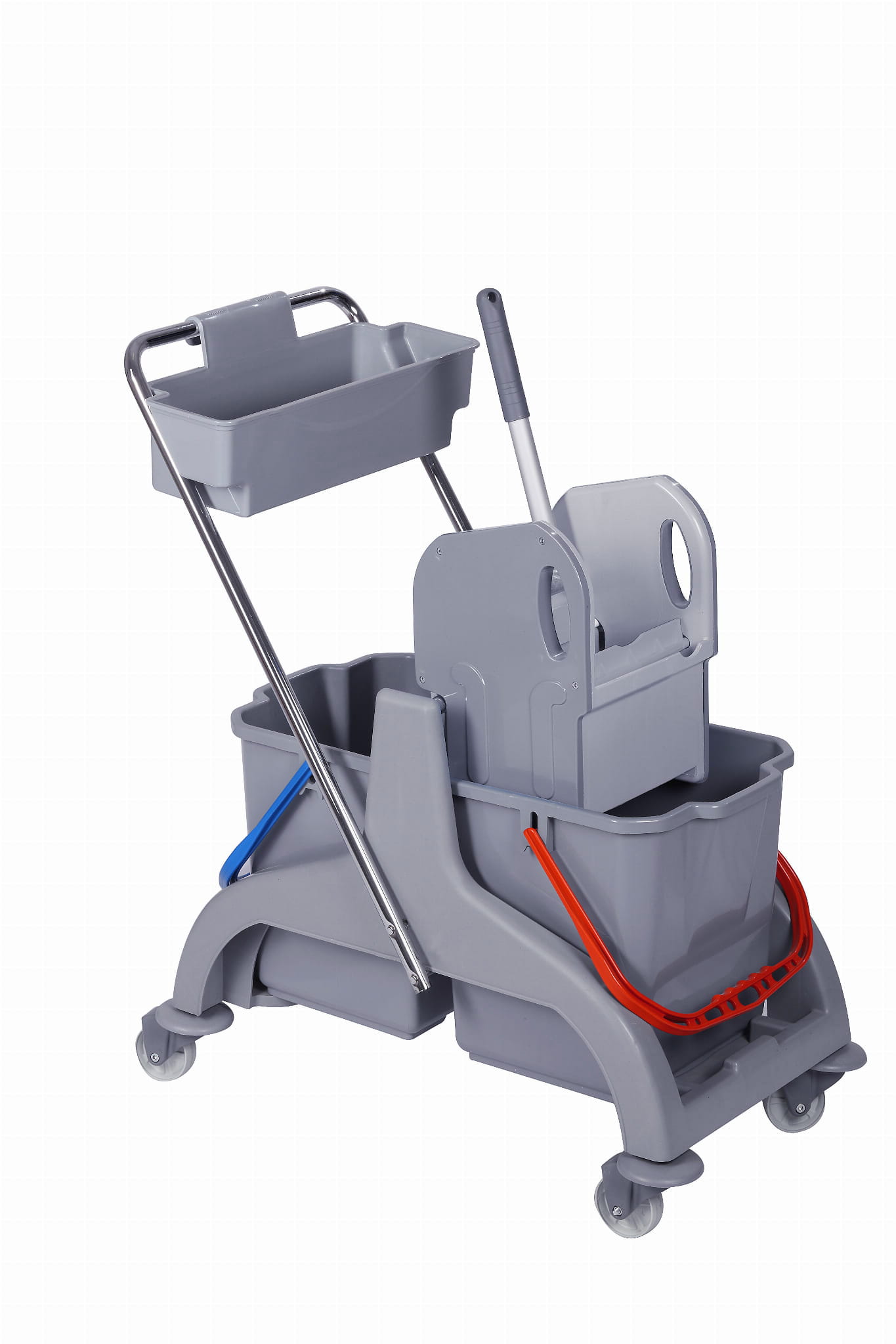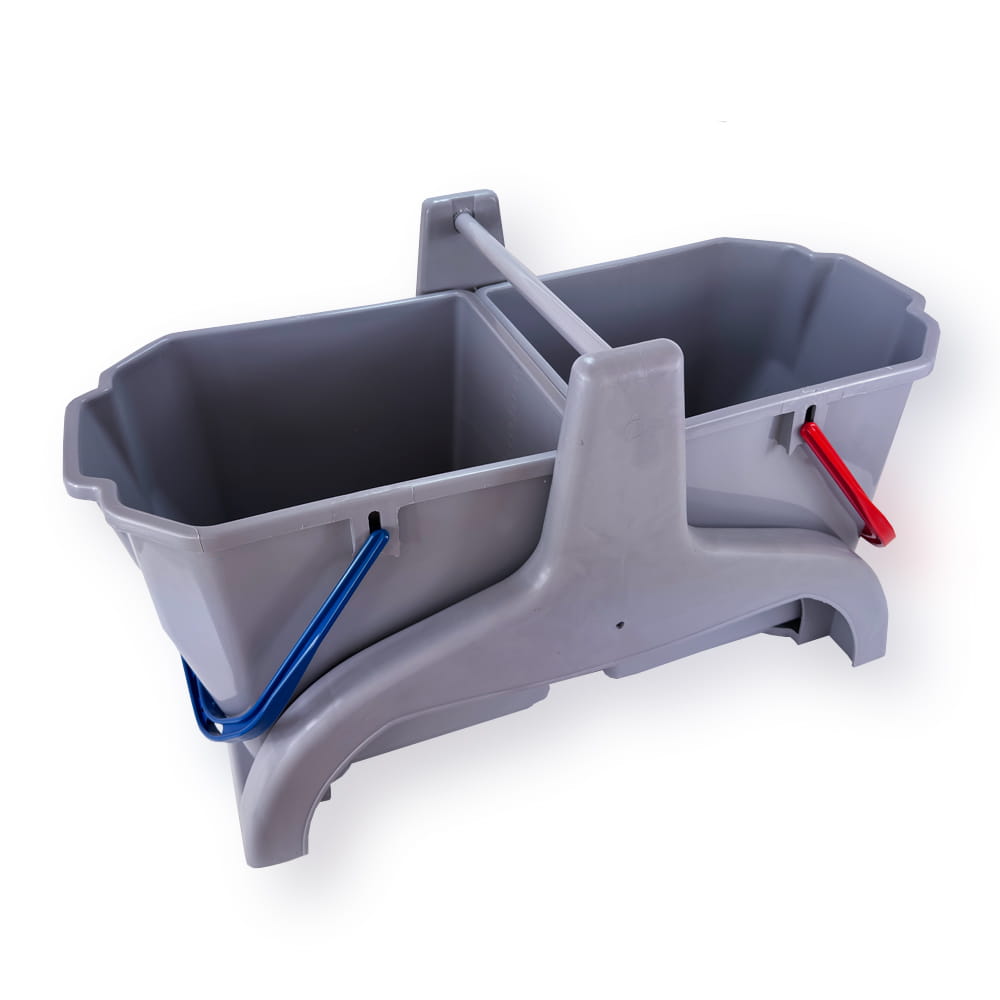 Wózek 2-wiadrowy to doskonałe rozwiązanie do profesjonalnego sprzątania. Posiada dwa wiadra o pojemności 25 litrów każde, korytko na chemie i akcesoria do sprzątania oraz prasę, dzięki której łatwo i skutecznie wyciśniesz nadmiar wody z mopa.